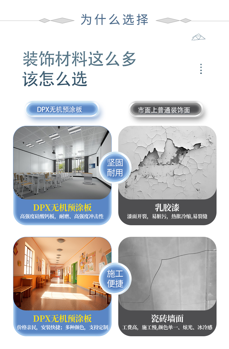 无机预涂板的耐撞抗损能力,源于其优质的基材与工艺。它以无机材料为基材,本身具备高密度、高强度的特性,能抵御桌椅碰撞、书包剐蹭等日常冲击,不易出现凹陷、变形、掉漆等问题。相较于传统的乳胶漆墙面、普通瓷砖,无机预涂板不会因频繁摩擦而失去光泽,也不会因轻微撞击就留下难以修复的痕迹,适配校园走廊的高频使用场景。