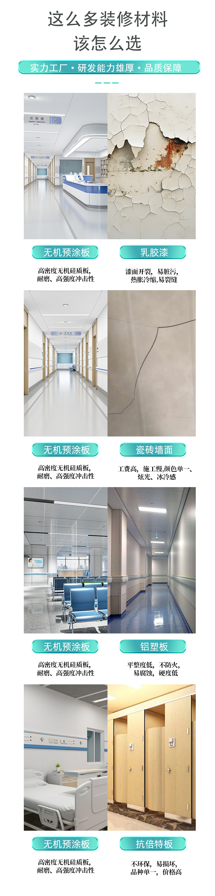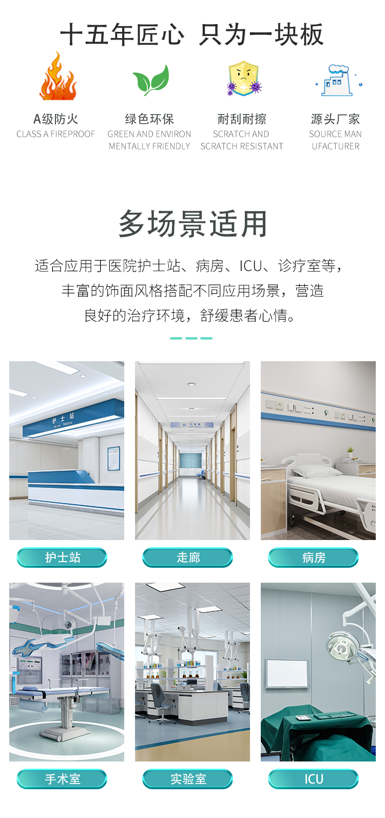 无缝整洁大气:板材拼接紧密、阴阳角可做圆弧处理,墙面整体一气呵成,无积污缝隙,视觉干净通透,彰显医院形象。