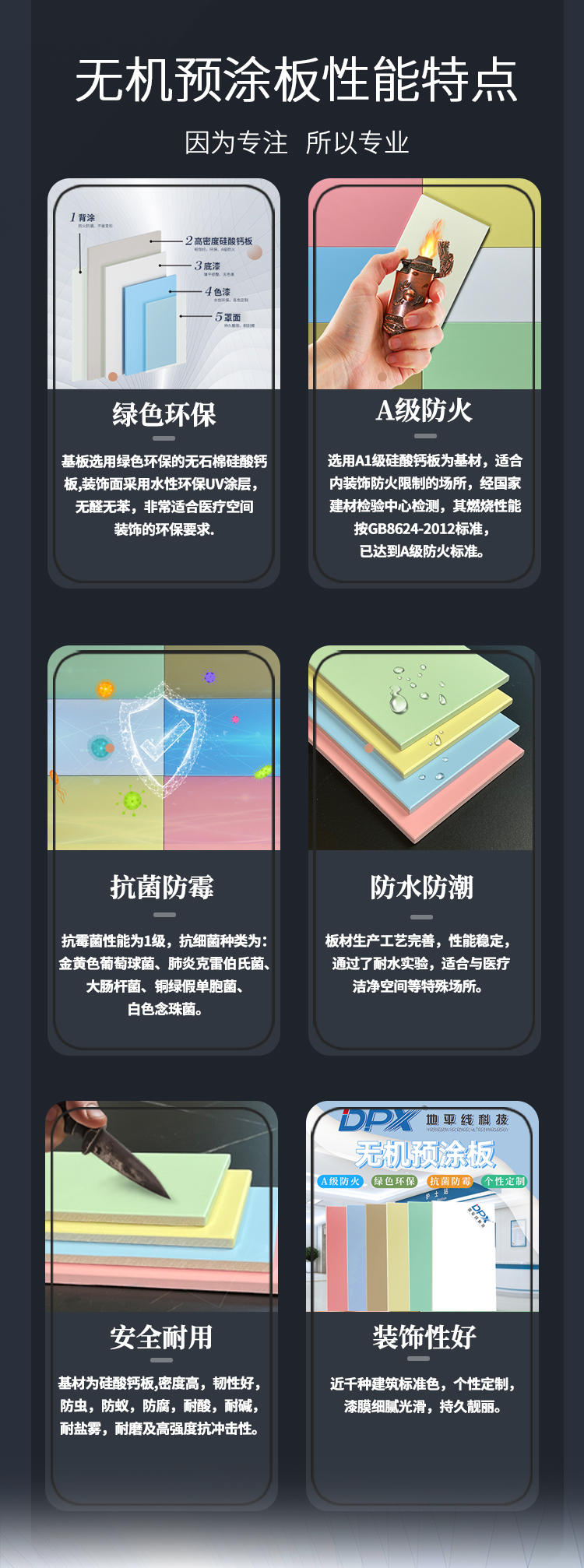 良好的防火阻燃能力:无机预涂板的基材主要由水泥、纤维等无机材料构成,本身不具备燃烧性,经检测可达到 A 级防火标准。在遭遇高温或火灾时,板材不会燃烧,也不会释放一氧化碳、氰化物等有毒有害气体,能有效阻止火势蔓延,为人员疏散和设备保护争取宝贵时间。