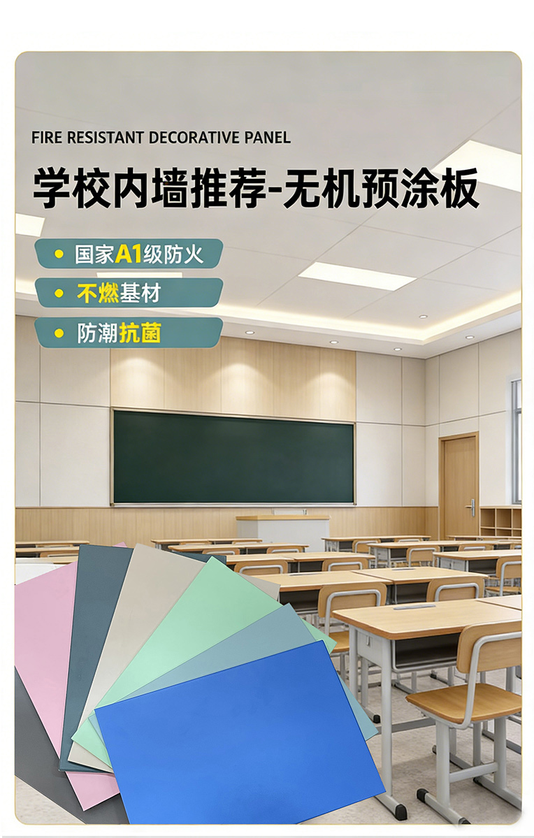 当前位置:首页 > 新闻中心 “孩子在学校安不安全?” 每天清晨送孩子入校,这句话都是家长心头的牵挂。校园作为人员密集的育人场所,消防安全更是底线中的底线。从教学楼的走廊转角,到实验室的墙面柜体,从楼梯间的生命通道,到宿舍食堂的高频区域,墙面材料的选择,直接关乎数千名师生的生命安全。无机预涂板凭借A 级不燃的硬核性能,搭配环保抗菌、抗冲击耐用的综合优势,成为校园防火安全的 “隐形卫士”,让学校安心管理,让家长放心托付。