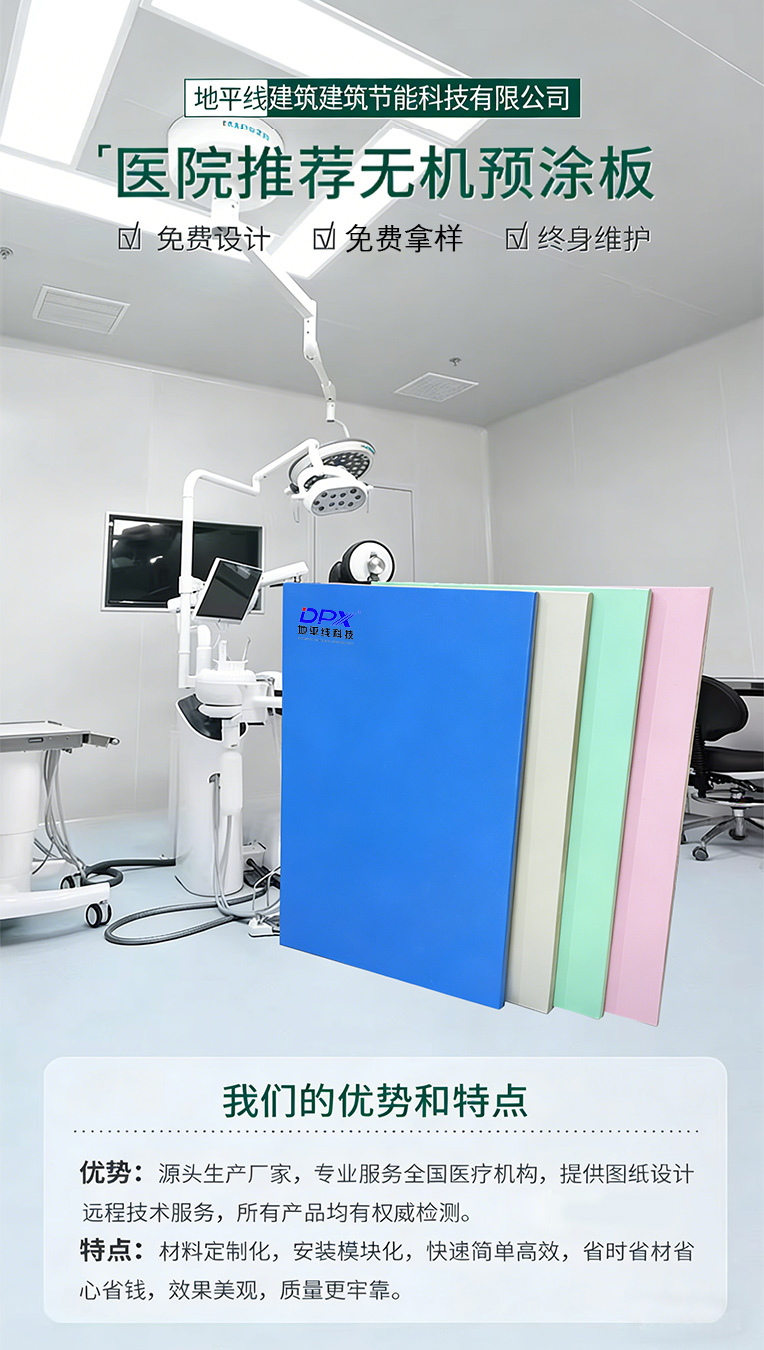 医疗空间的诉求是洁净与安全,这也是无机预涂板立足医院场景的底气。不同于普通建筑,医院墙面需长期承受高频次消毒擦拭、物理撞击与潮湿侵蚀,传统乳胶漆易发白粉化、瓷砖易藏污纳垢的痛点,早已难以适配现代医疗环境的严苛要求。无机预涂板以无石棉硅酸钙板为基材,搭配特殊聚酯涂层或UV固化涂层,经工厂自动化流水线预制而成,其表面致密光滑,耐化学腐蚀性优异,无论是碘伏还是各类消毒液,均可轻松擦拭干净,不残留、不变色、不破损,杜绝卫生死角。同时,板材表面可定制抗菌涂层,能有效抑制大肠杆菌、金黄色葡萄球菌等常见致病菌繁殖,结合其不起尘、不易附着灰尘的特性,大幅降低院内交叉感染风险,为医护人员与患者构建起一道无形的防护屏障,契合医院无菌环境的标准。