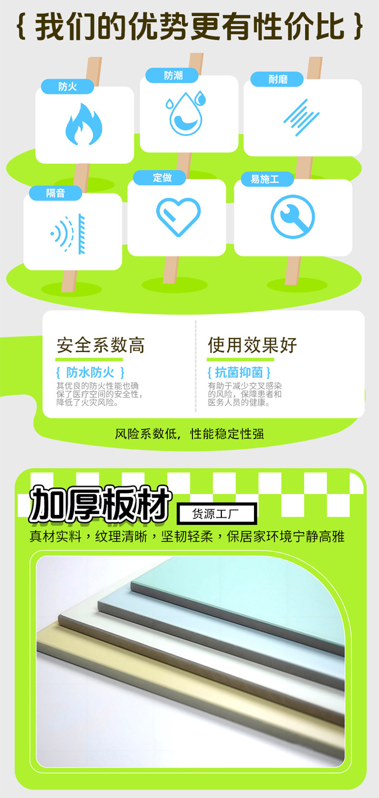 这种结构,从根本上杜绝了材料本身产尘的可能 —— 无机基材不会老化掉粉,涂层与基材分子级结合,不会脱落掉渣。同时,光滑无孔的表面,让空气中的尘埃,根本无法附着和渗透,只能停留在表面。医护人员只需要轻轻一擦,就能清除,做到了 “无积尘、易清洁”,支撑起手术室的层流洁净标准。